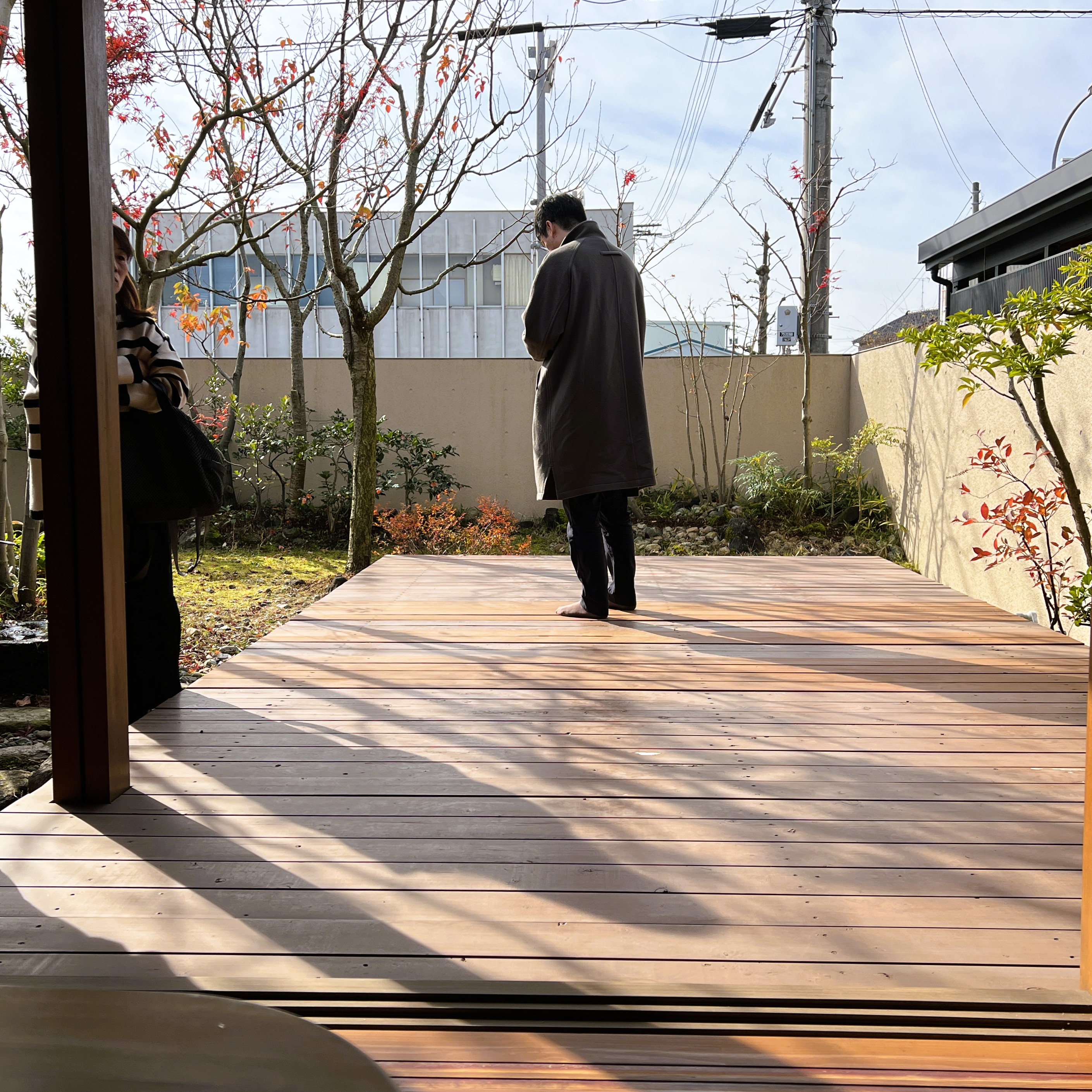 真っすぐ伸びるウッドデッキ越しに庭を楽しむことができます