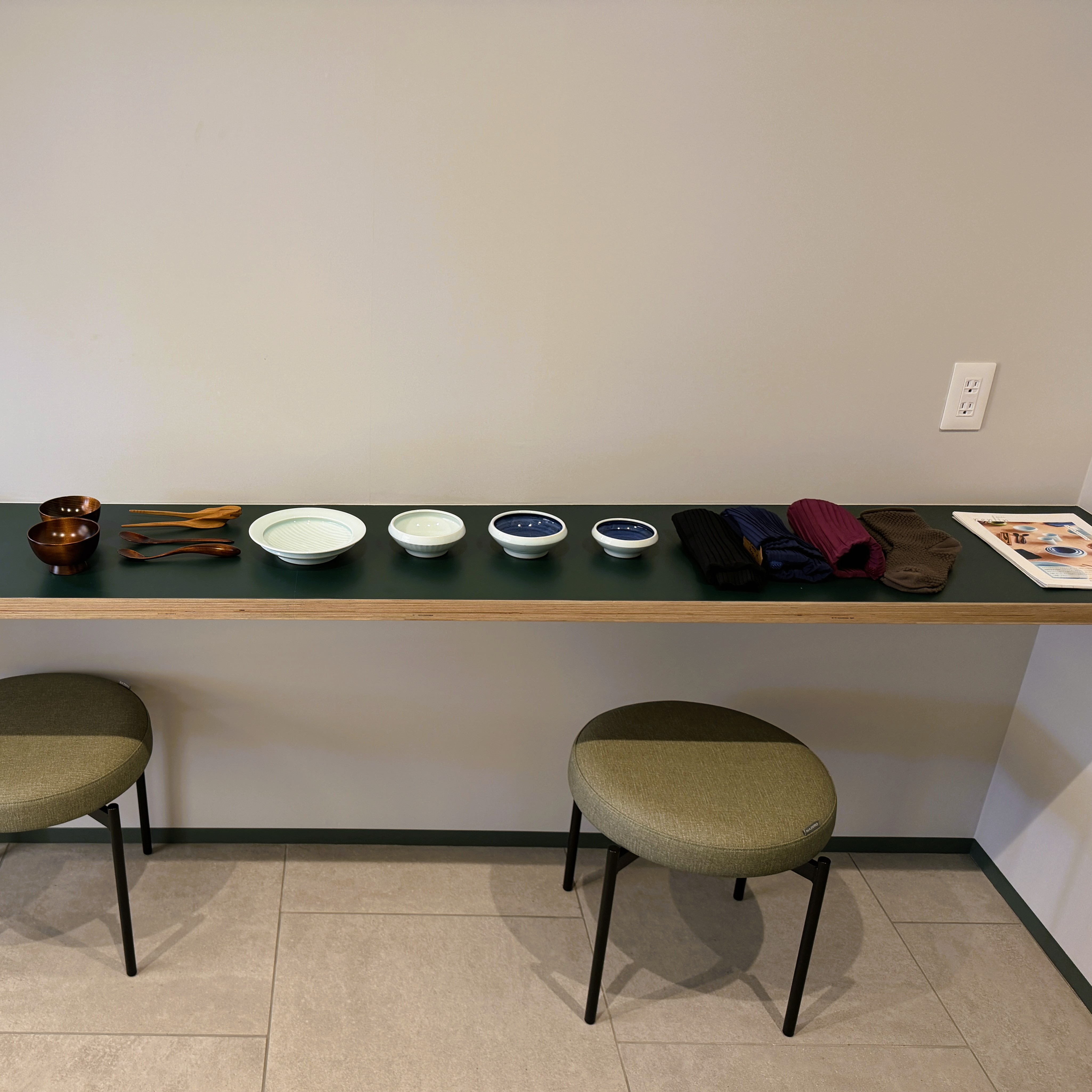 階段下にnenlinさんが扱うケアの道具が展示されていました